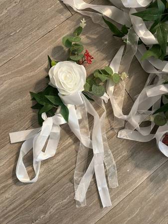 Large welcome to our wedding sign 23 pew flowers in white and three in yellow. A card light up sign, InLovingMemory signs a hair clip a cake topper. Reserved hanging, Mr. and Mrs. decoration and a...